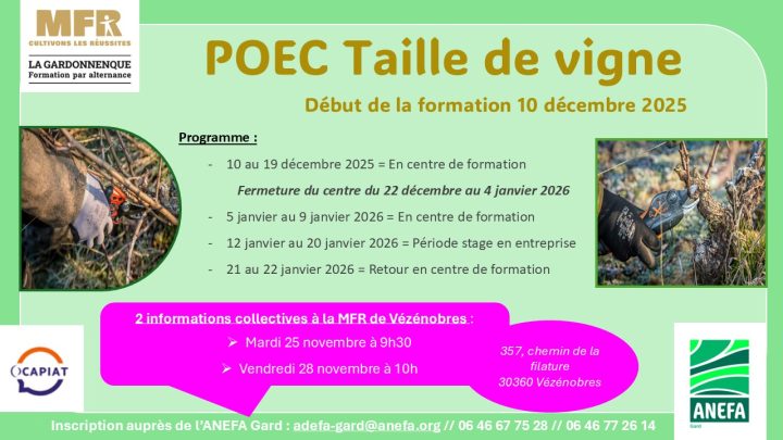 Informations collectives le 1er juillet à 10h ou le 8 juillet à 10h à la MFR de Vézénobres. Inscription et renseignements auprès de l’ANEFA Gard.