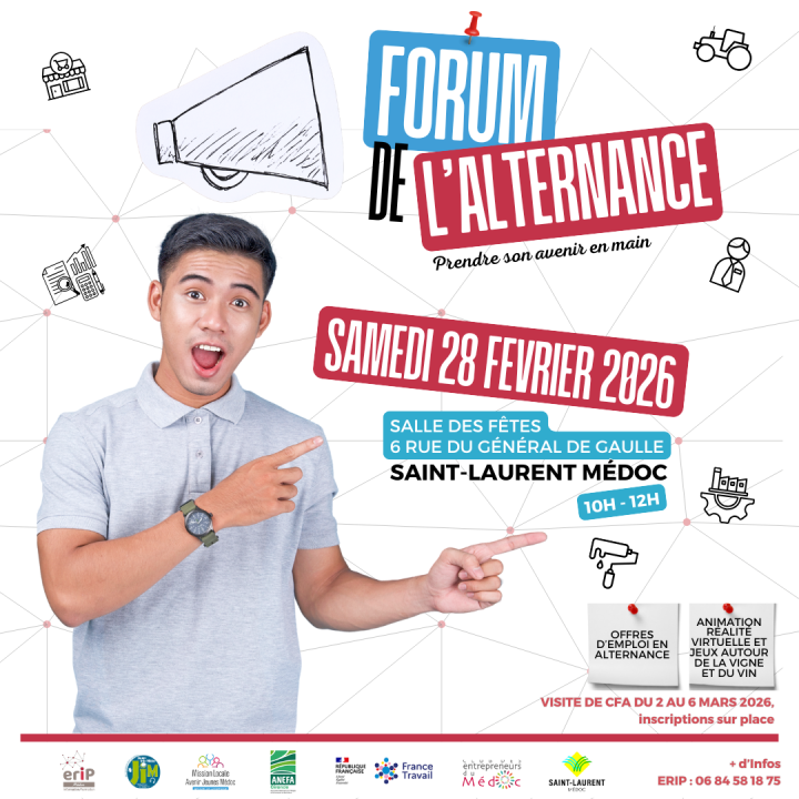 L’ANEFA Gironde sera présente au Forum de l’Alternance du Médoc le samedi 28 février 2026, de 10h à 12h, à la Salle des Fêtes de Saint-Laurent-Médoc. Cet événement, organisé en partenariat avec l’ERIP Médoc pour promouvoir les parcours en alternance, constitue une occasion privilégiée pour les jeunes, les demandeurs d’emploi et les personnes en reconversion de découvrir les métiers du secteur agricole et les opportunités de formation qui y sont associées.