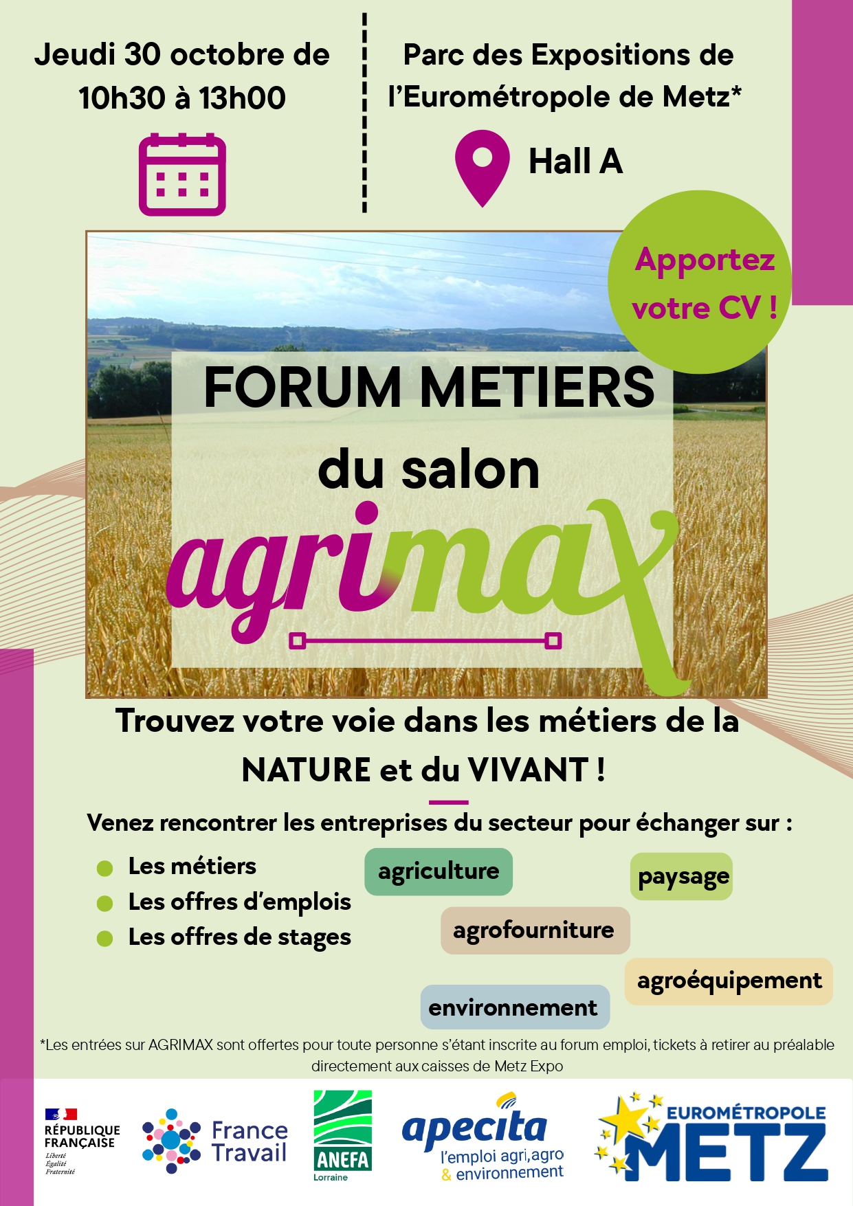 L’ANEFA Lorraine et l’APECITA GRAND EST et l’Eurométropole de Metz vous proposent le FORUM METIERS « Trouve ta voie dans les métiers de la NATURE et du VIVANT ! », organisé le :