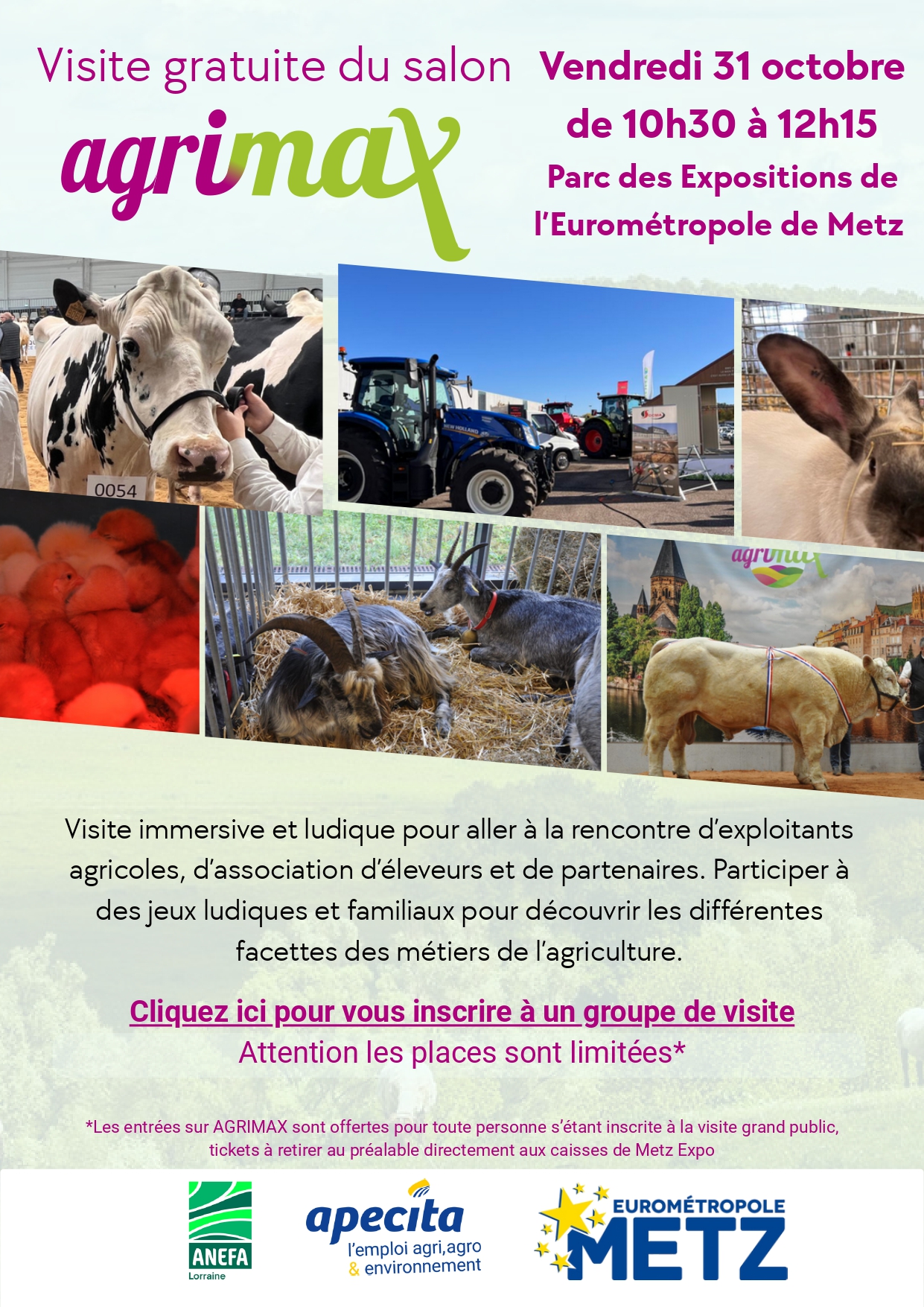 Dans le cadre de la 14ème édition d’AGRIMAX, salon professionnel de l’Elevage, qui se tiendra du 29 au 31 octobre 2025 au Centre Foires et Conventions de l’Eurométropole de Metz, les acteurs de l’EMPLOI et la FORMATION vous proposent de nombreuses animations.