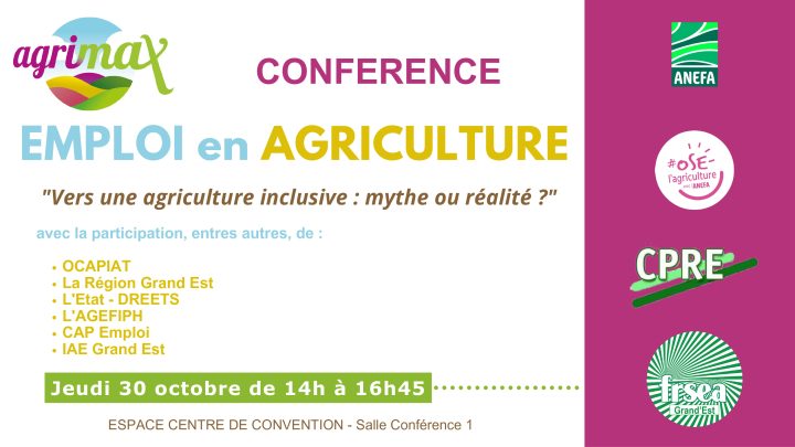 La FRSEA Grand Est, la CPRE Grand Est et l’ANEFA vous propose une Conférence sur les Métiers, les emplois et la formation le jeudi 30 octobre de 14h00 à 16h45 à l’Espace conférence :