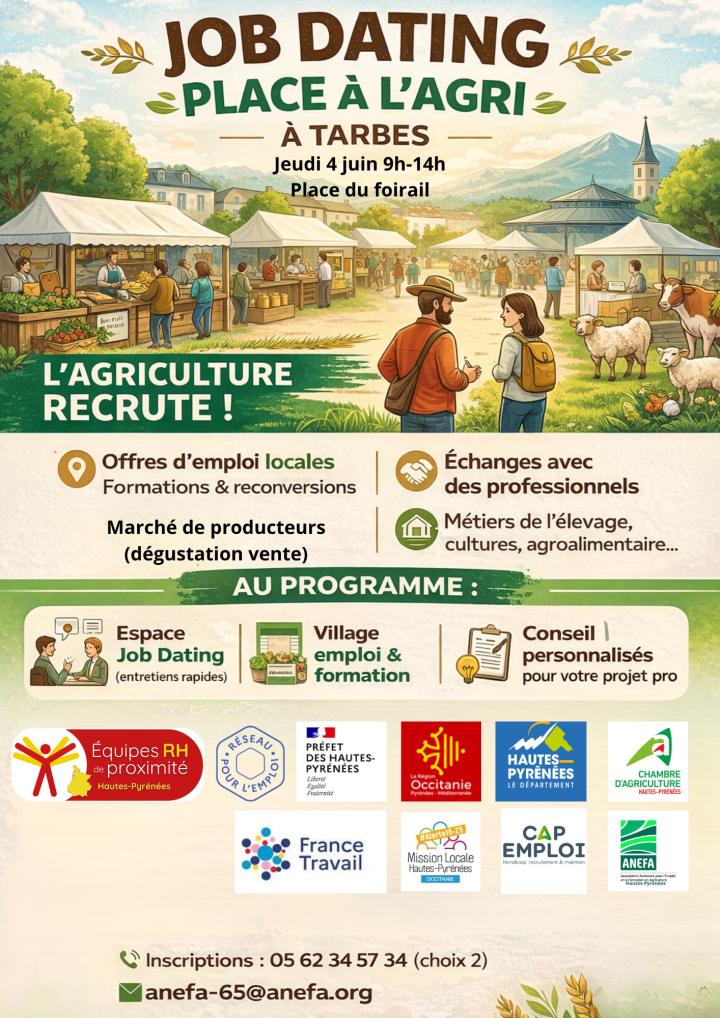 Dans le cadre de Place à l’Agri 2026 à Tarbes, l’ANEFA 65 organise un Job Dating dédié à l’emploi agricole, le jeudi 4 juin 2026 de 9h à 14h, sur la place du Foirail à Tarbes, en collaboration avec le Réseau pour l’emploi.