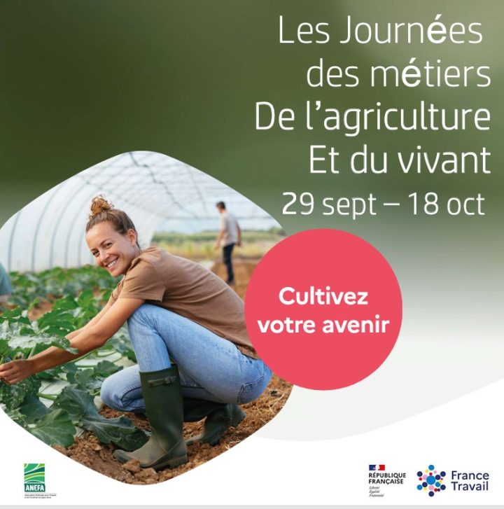 A partir du 29 septembre 2025, auront lieu les Journées de Métiers de l’Agriculture et du Vivant, organisées par le réseau ANEFA et France Travail.