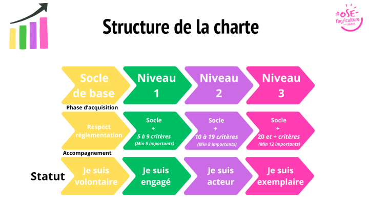 L’adhésion à la Charte est un engagement volontaire de la part des employeurs agricoles. Totalement gratuite, la Charte fonctionne par paliers : le socle de base (droit du travail, sécurité) auquel s’ajoute les critères importants et les critères bonus encourageant la progression des bonnes pratiques.